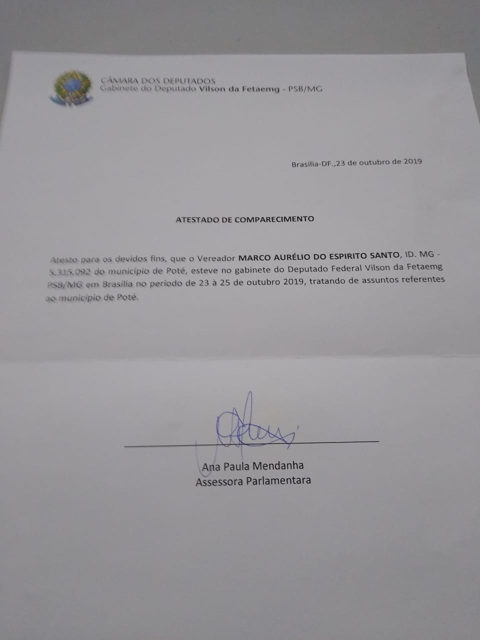 O Sr vereador Marco Aurélio do Espírito santo esteve em Brasília no gabinete do deputado federal Vilson da fetaemg